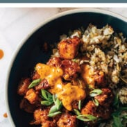 How to Make Cauliflower Garlic Rice: This is totally optional – just something I enjoy with this tofu if I can handle one extra sheet pan in the mix. On a separate sheet pan, add a bag of cauliflower rice. Drizzle with oil and season generously with salt. Add to the oven at the same time as the tofu; roast until very browned and flavorful, about 30-40 minutes, stirring occasionally. Add about 2 cups cooked rice directly to the pan, along with 1/2 teaspoon garlic powder and a squeeze of lemon. Toss to combine, return to the oven for a minute to warm it all up, and you’re done!