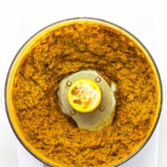 - Once the aromatics are finished in the oven, blend everything up in a food processor or a high-powered blender to form a yellow paste to your desired consistency. Smooth paste or something a lil’ more chunky? Both work! Boom! How simple is that?