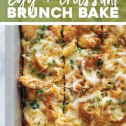 - Bake: Cover with foil. Bake for 30 minutes, depending on oven and pan size. Remove foil and bake for another 5-10 minutes. You don’t want to overcook the eggs (gross) but the middle should be almost completely firm when you give the pan a quick jiggle test. You’ll also notice the whole thing will be just starting to puff up a bit. Slice, serve, and brunch forward!