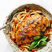 5. Just before serving, stir in the basil. Top servings of pasta with the chicken and the sauce.