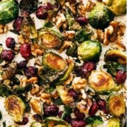 Let’s talk about these roasty, sweet, nutty brussels sprouts that combine those tender-crisp, whole-brussel bites with the ultra thin and crispy leaves, all coated with a lil’ mustard-maple drench and speckled with juicy bites of dried cranberry. Oh my gosh. WHY ARE THEY SO GOOD.