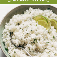 Image that say "How to Cook Rice." There's a bowl of white rice with flecks of cilantro and lime wedges behind it with a spoon in the rice bowl.