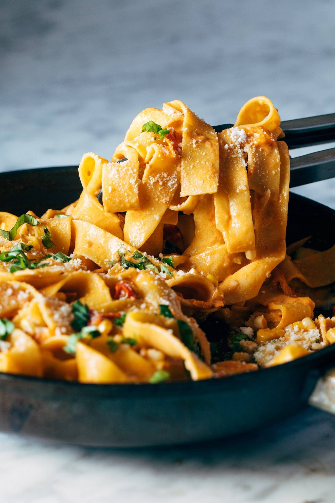 A seriously delicious fresh summer pasta. Creamy, silky noodles, garlicky shrimp, and a punch of fresh corn, cherry tomatoes, and basil.