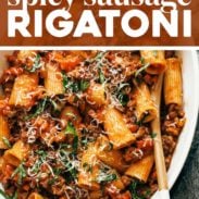 This Spicy Sausage Rigatoni is so simple and SO GOOD. Chewy tubes of rigatoni swimming in a delicious sauce made of Italian sausage, San Marzano tomatoes, red wine, and spices.