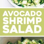 This Avo Shrimp Salad is reminding me of three other things: avocado egg salad (another swap-mayo-for-avocado salad situation), goddess curry chicken salad (another cold, creamy, healthy summer lunch), and a standard shrimp roll. Like, you know, the kind of shrimp roll you’d imagine getting on a boardwalk or something? I mean, I’ve never ACTUALLY eaten a shrimp roll on a boardwalk. But it just kind of seems like the right thing to associate this with – almost like you could stuff this cold, creamy goodness into a bun if you wanted to really go that direction, right? But you don’t even need to. It’s good enough on its own. Boardwalk not included.